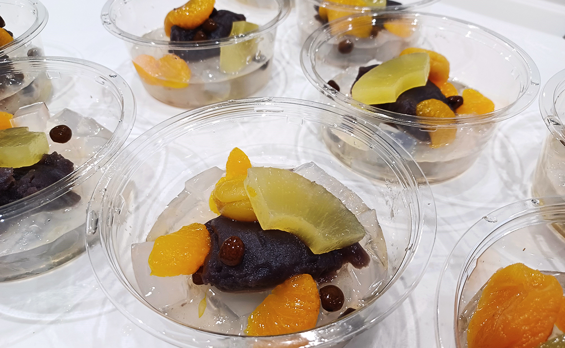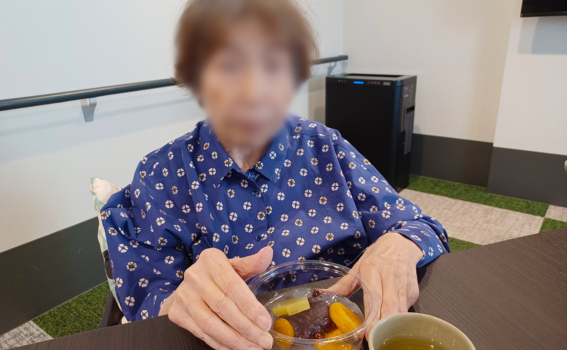 本日は夙川にある菓一條 栄久堂吉宗のあんみつを召し上がっていただきました。 お持ち帰り用に作られたあんみつは寒天、果物、自家製餡がそれぞれ別に袋詰めしてあります。 自家製の寒天には糖分が含まれていないそうで、別添えのシロップをかけて楽しみます♪ 「寒天の味がしっかりしているわ」と、入居者様からもお声が上がり、甘く炊かれたドライアプリコットも相性抜群だったようで、 「久しぶりに食べたけど、美味しくて幸せやわ~♫」と笑顔溢れるお茶会となりました。