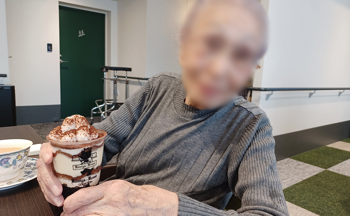 今月の洋菓子はケーニヒスクローネのティラミスパフェです♬ ケーニヒスクローネは神戸に住んでおられる方には馴染のある洋菓子店で、皆様とても楽しみにしておられました。 「このパフェ懐かしいわ~!久しぶりに食べるわ!」と喜びの声が上がりました♪
