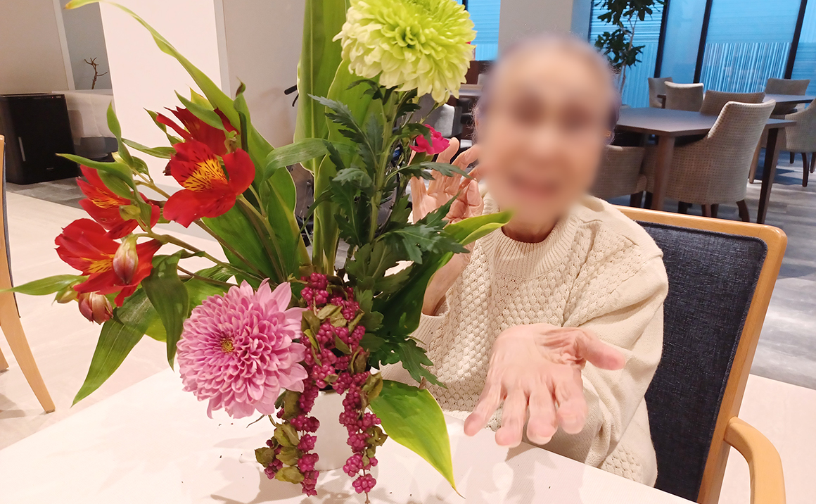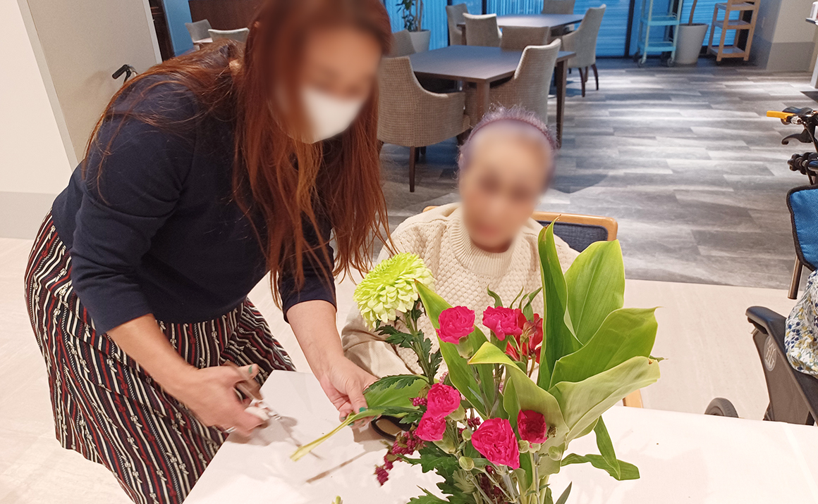 本日はクレマチスさんと一緒にフラワーアレンジメントの時間です。 お花を見るとすぐに立ち上がってどんどんハサミを入れていく方、先生と相談しながら少しずつ進めていく方とさまざまで、 皆さま真剣にお花と向き合う姿が印象的でした。