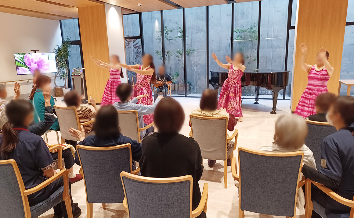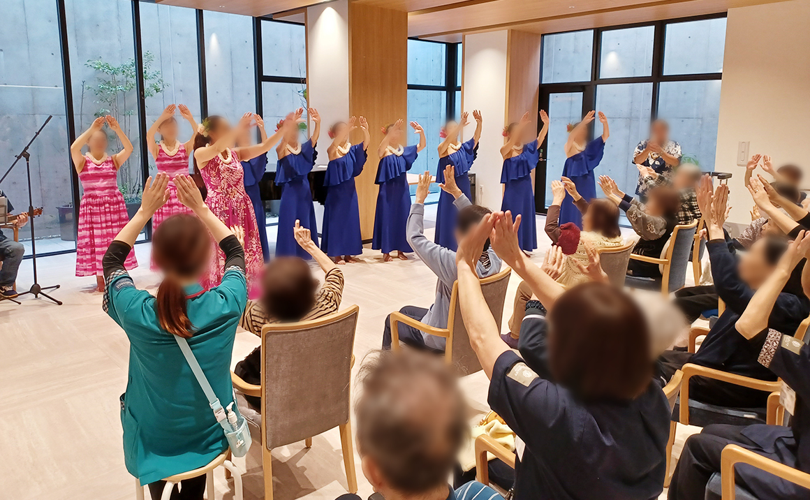 本日はプレザングラン岡本にフラダンスチームの Ka Pa Hula O Anelaokala(カ・パー・フラ・オ・アネラオカラ)さんがやってきました♬ ウクレレに合わせてフラダンスを踊る姿に「華やかで綺麗ね~」「難しいけどやってみたら楽しかったよ♪」 と一緒に体を動かされ、ウクレレの演奏に合わせて合唱も楽しまれていました。