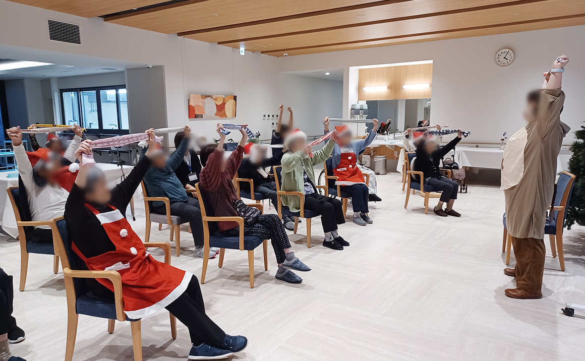 昭和歌謡で楽しく歌って健康体操♫の西端先生に来ていただきました! 3回目となる西端先生の歌と体操、恒例になっている季節の仮装に皆さま「可愛くなってるかしら?」「写真撮って~!」と盛り上がります。 最後はタオルを持って”いい湯だな♪”を歌って踊って体もポカポカになりました♬