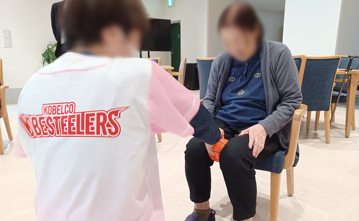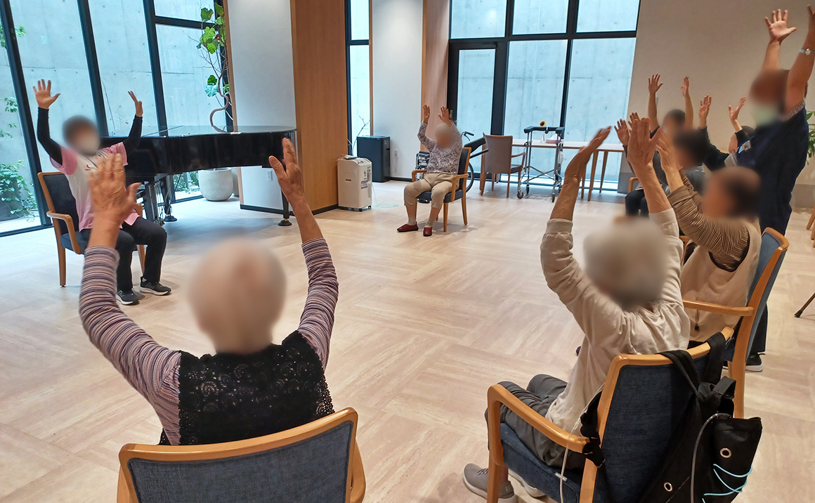 講師を招き、月二回行われる健康体操の時間です。 参加するメンバーも少し増え、賑やかになってきました。 先生の動きに合わせてストレッチを行い、棒体操・ボール体操に取り組みます。 苦手だった動作も毎月続けることによって少しずつできるようになり、「今日はスムーズにできたわ!」と喜びの声も上がります。 先生のパワフルで元気な指導に皆さま「先生から元気もらえるね!頑張らなくちゃ」と気合十分な時間を過ごされました。
