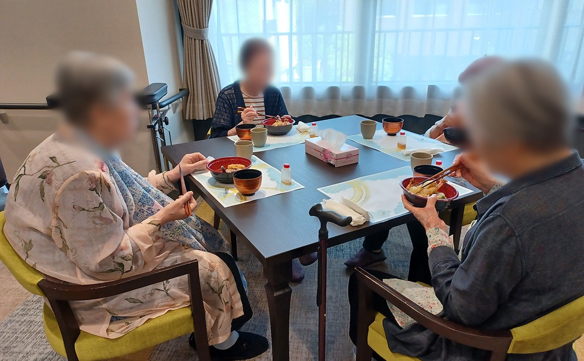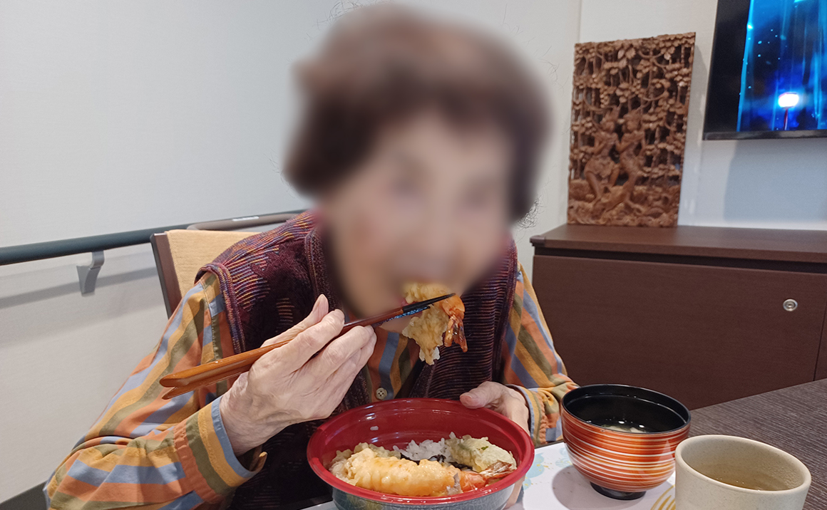 プレザングラン岡本の近隣にある、“天ぷら 天介”さんの天丼を召し上がっていただきました。 大きな海老に鱚やアナゴ、季節のお野菜の天ぷらを楽しんでいただきました。 天丼には天介特製、アツアツのタレを皆さまのお好みでかけていただき、 「温かいタレをかけたら美味しいね!」「海老が大きくてプリプリよ!美味しい」と喜びの声が上がります。 「天丼なんて食べることないからね。美味しかったよ。」と大満足のランチタイムを過ごされました。