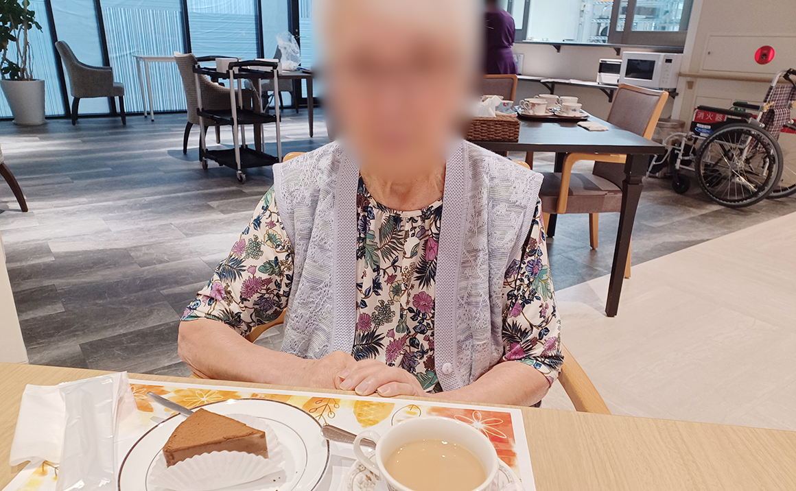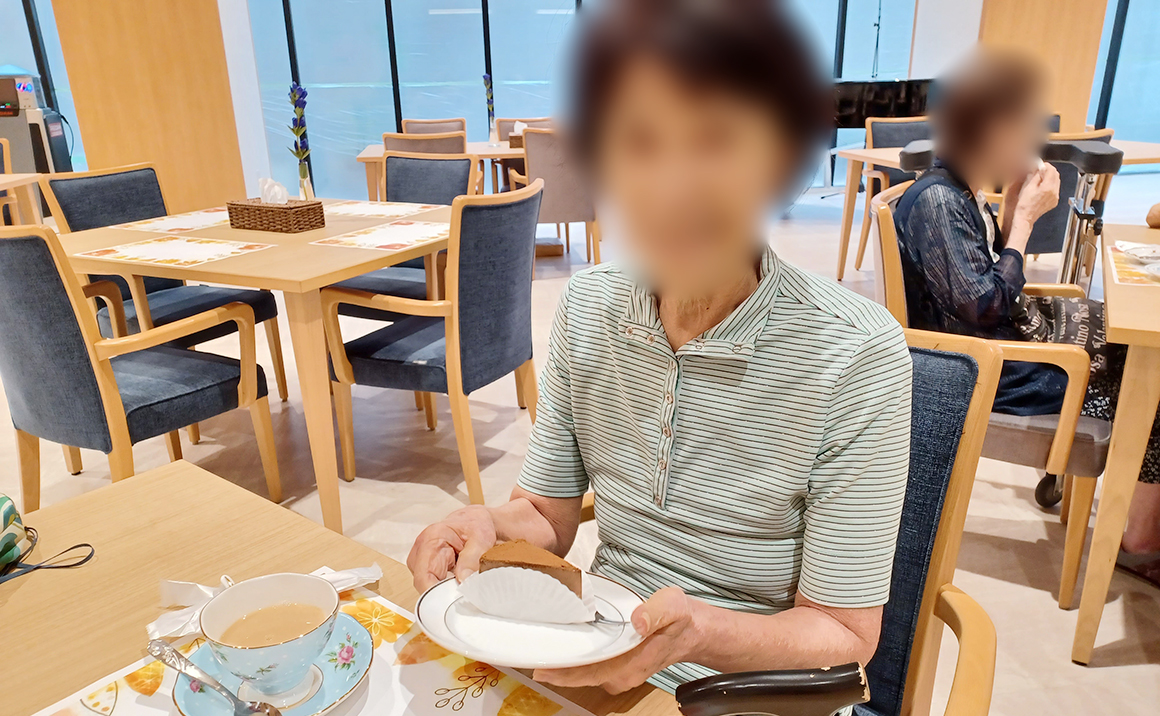 今回のお茶会は神戸市住吉にあるPATISSERIE CASSALADE(パティスリーカッサレード)のチーズケーキをお取り寄せしました。 たくさんのチーズケーキの中から、今回はダブルショコラとレアチーズケーキの二種類からお好きなケーキを選んでいただきました。 柔らかくて滑らかなチーズケーキとサクサクのクッキー生地は入居者の皆さまも食べやすく、 「チーズケーキなんて久しぶりに食べたわ~!」「あっという間にぺろっと食べれちゃうね」と美味しく、楽しいお茶会の時間を過ごされました。