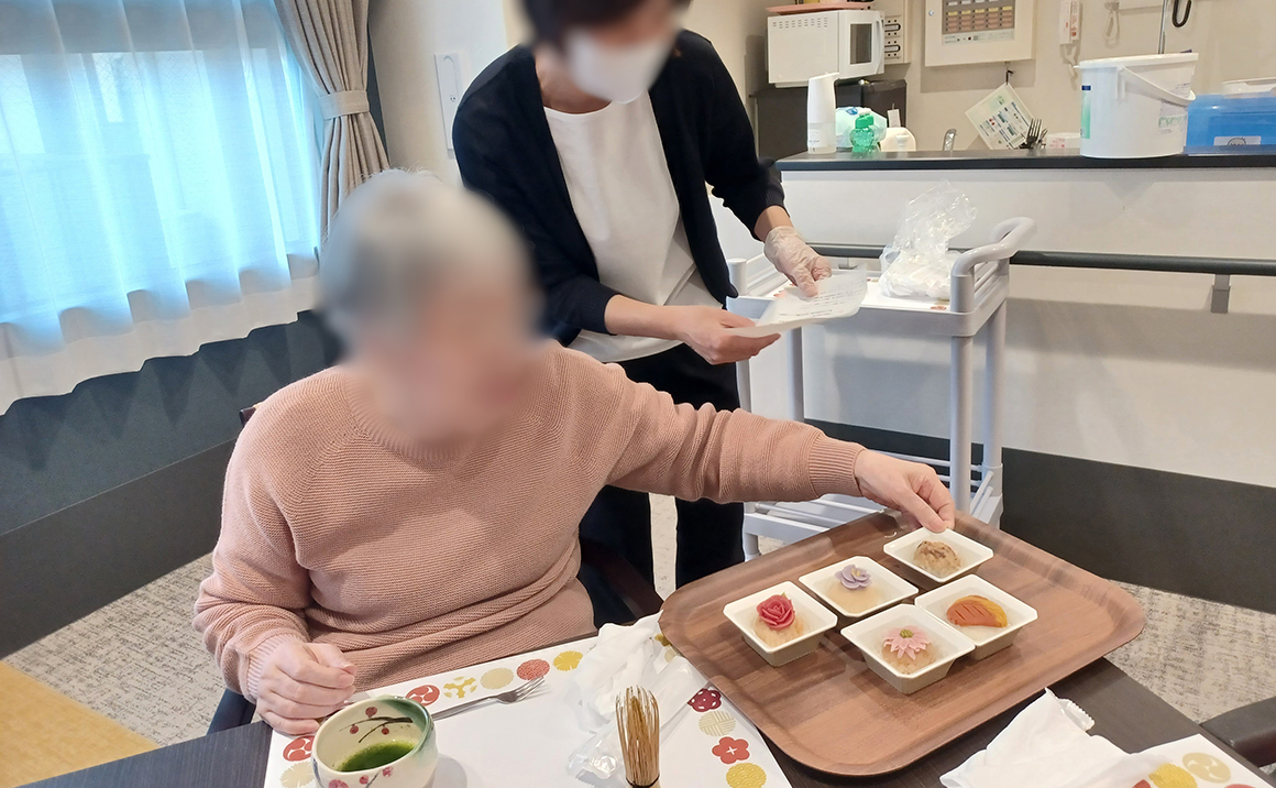 本日は、コンシェルジュサービスのイベントとして和菓子のお茶会を開催しました。和菓子は岡本の「Oh!Haggy!」さんからお取り寄せしました。5種類の和菓子からお好みの一品を選んでいただき、ご自身でたてた抹茶とともにゆっくり味わっていただきました。上品な甘さと香り高いお茶に、皆さま自然と笑顔が広がるひとときとなりました。