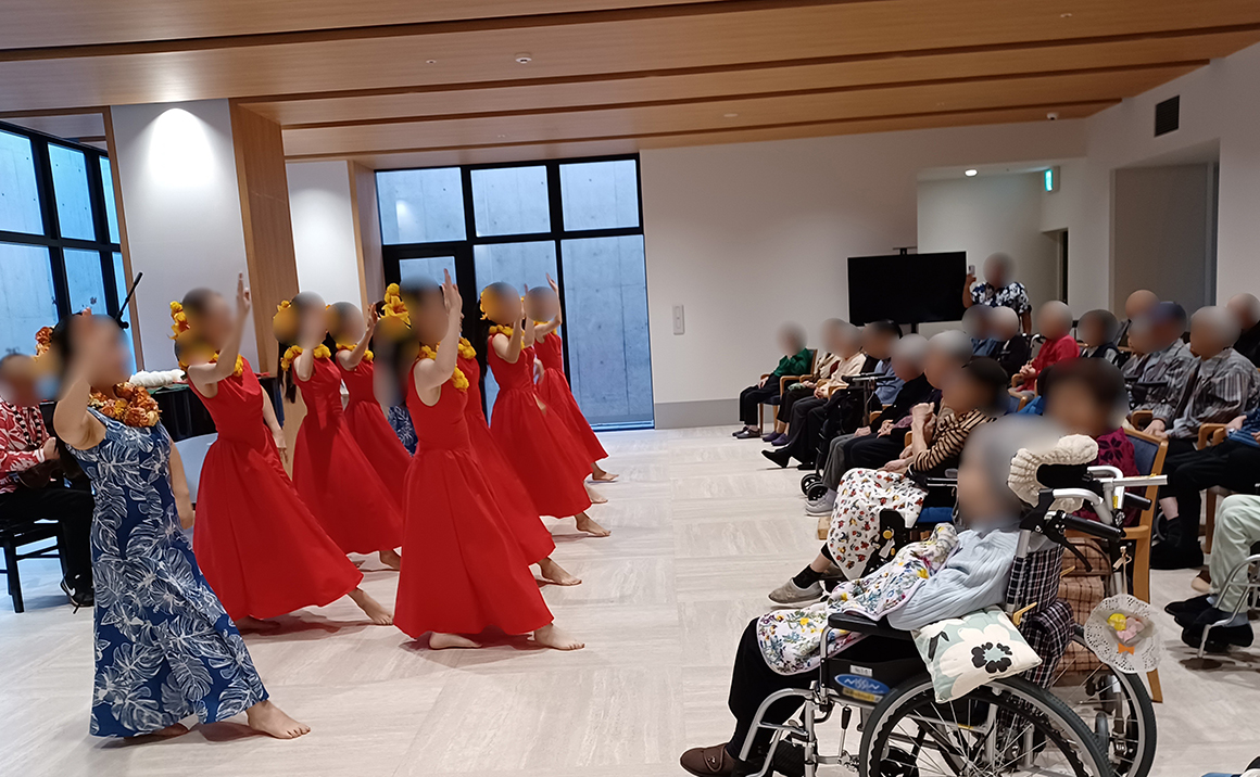 本日は、フラダンスチームの皆さまが来所してくださいました。 色鮮やかな衣装とやさしい音楽に包まれ、会場は一気に南国の雰囲気に。 入居者様も手拍子や笑顔で楽しまれ、手のふりをまねたり、クリスマスの歌を一緒に歌ったりと、笑顔あふれる心温まる時間となりました。 フラダンスチームの皆様、素敵な時間をありがとうございました。