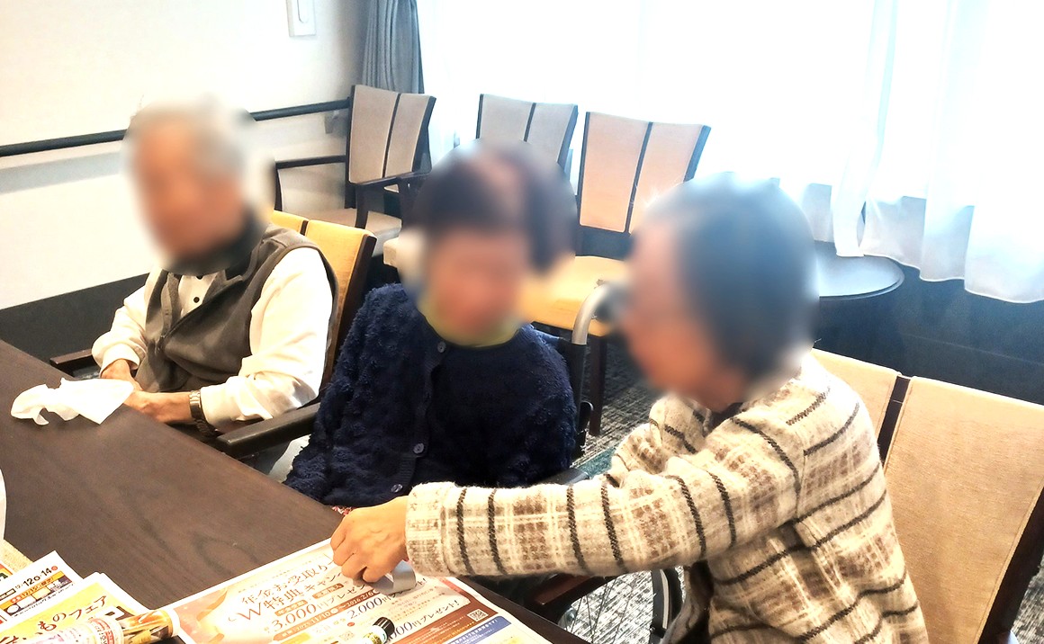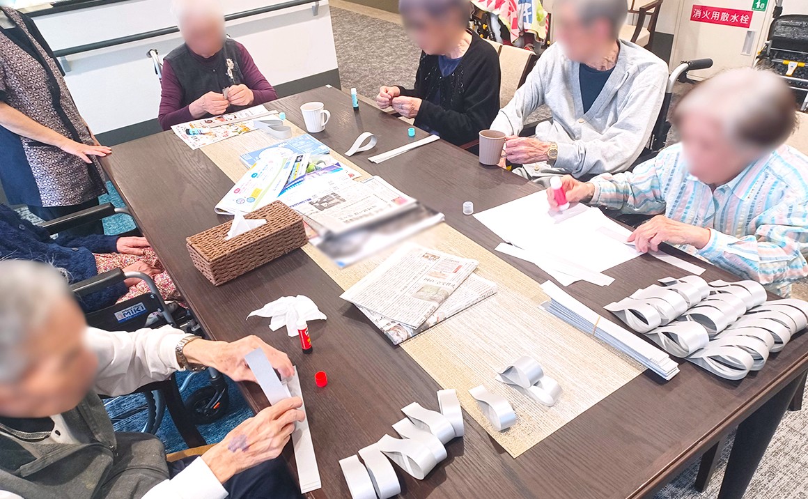 何やら真剣な表情で手を動かす皆さん。 「これは何になるの?」「内緒内緒!」「できあがってからのお楽しみ」 スタッフもご利用者さまも、完成形はまだひみつです。 さてさて、この写真の中で作られているものはいったい何でしょう? 写真を見ても、何を作っているのかさっぱりわかりません(笑) 答えは…クリスマス会当日のお楽しみです。