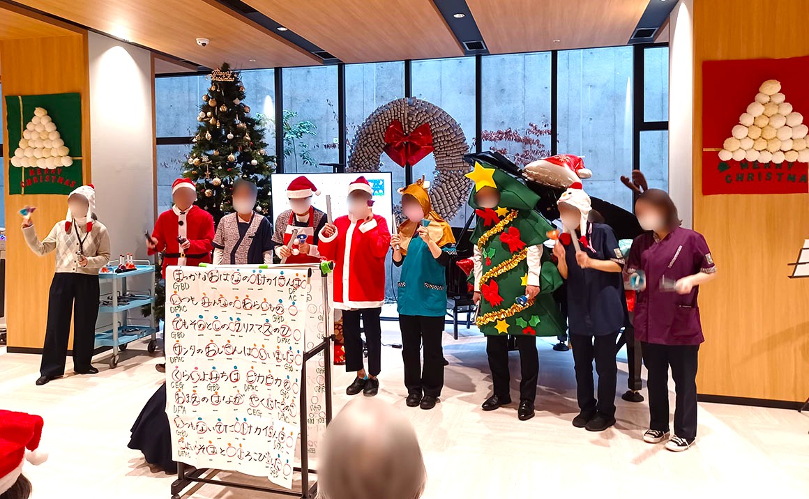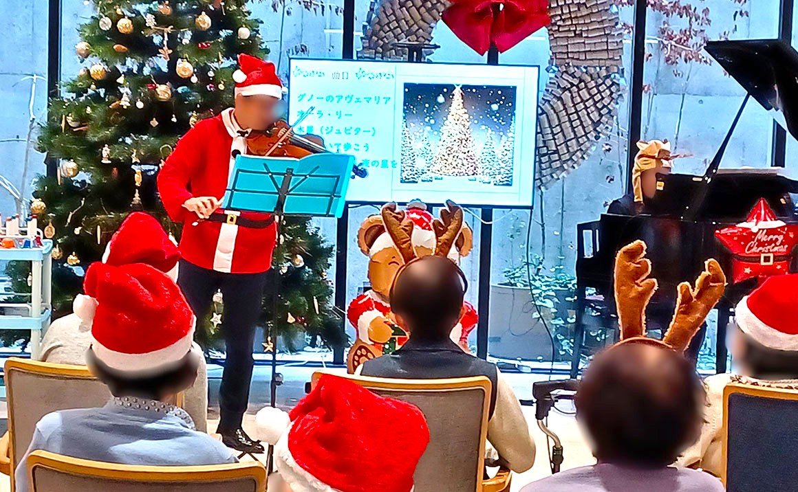 音楽療法の日に、クリスマス会を兼ねたイベントを行いました。 この日は普段のピアノ演奏に加え、バイオリンとオーボエの演奏もあり、華やかな音色が会場いっぱいに広がりました。 途中では入居者様と施設職員が一緒にハンドベル演奏に参加し、笑顔あふれるひとときとなりました。 そして会場の飾りつけには、先日のブログで出題したクイズの答えも登場!