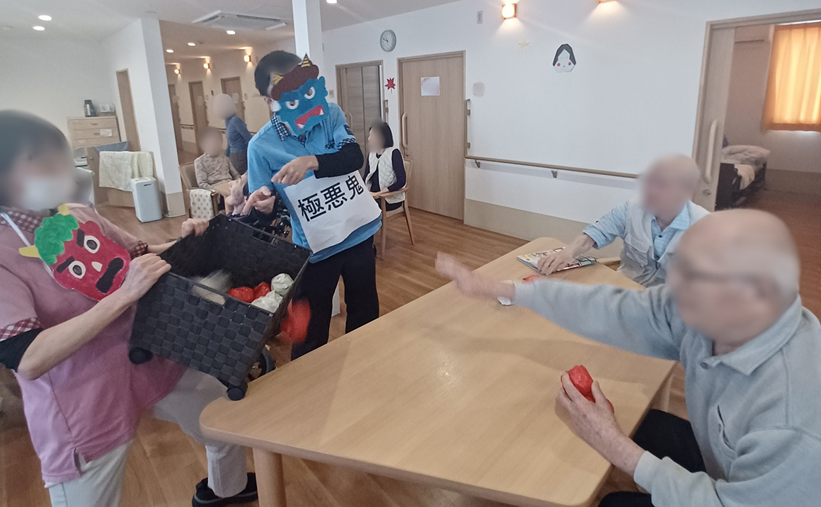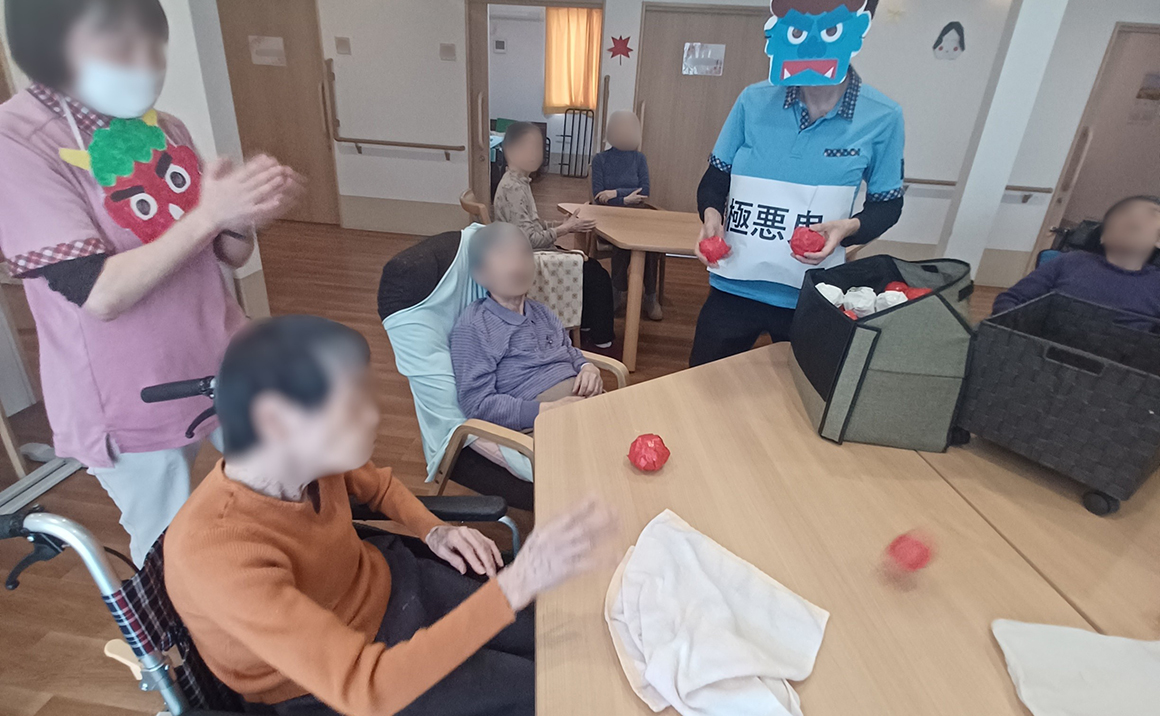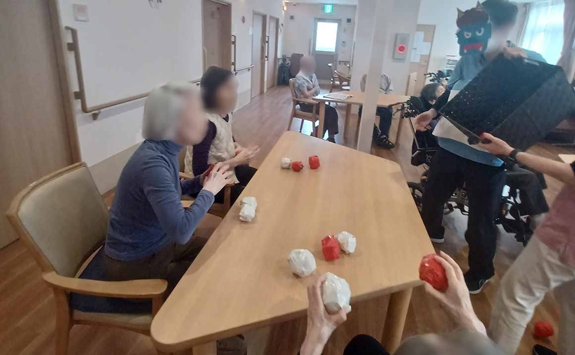 2月3日は節分ですね! たのしい家茨木真砂ではご利用者様と職員で豆まきを行いました。 豆の代わりにボールにはなりましたが鬼を追い払い、福をを呼び寄せることができたと思います。 また最後には恵方巻を模したロールケーキを一緒に食べました!