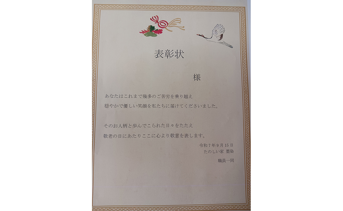 おはようございます!こんにちは!こんばんは!たのしい家墨染です♪ コロナの再流行にインフルエンザも流行ってるとか・・・(´;ω;`) それにも負けず、今月は【敬老の日】にてイベント開催(*^^)v 表彰状を作成し、お一人ずつ手渡し♪感極まって泣いてしまわれた利用者様も(;'∀') 今後も利用者様に感動し、喜んで頂けるようなイベントをドンドン行っていきます(≧▽≦)