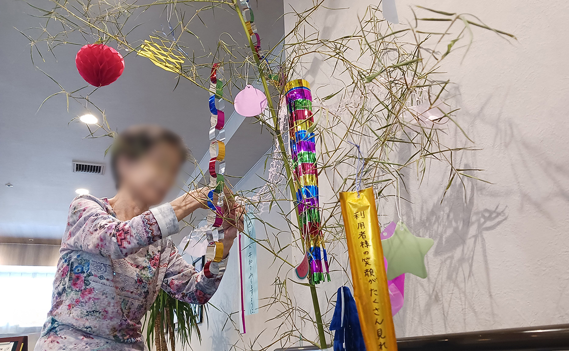本日は七夕ですね。 しかも今年の七夕は令和7年7月7日ということもあり、とても縁起がいいですよね。 そして皆様、思い思いの願いを短冊に込めました。 自作で星の飾りをお作りになられた利用者様もご家族と一緒に楽しそうに飾られていましたよ。
