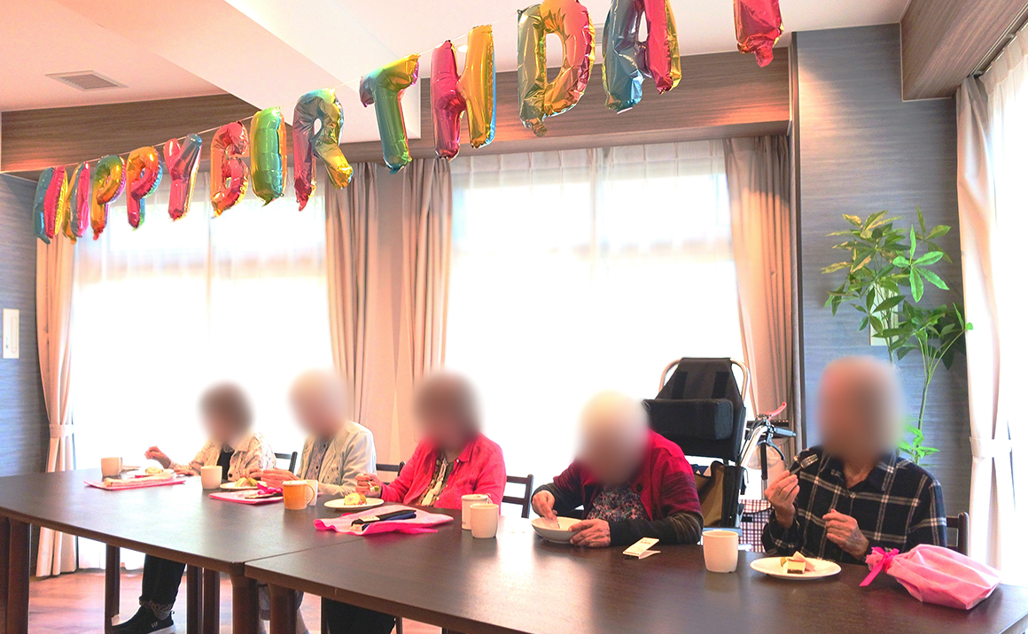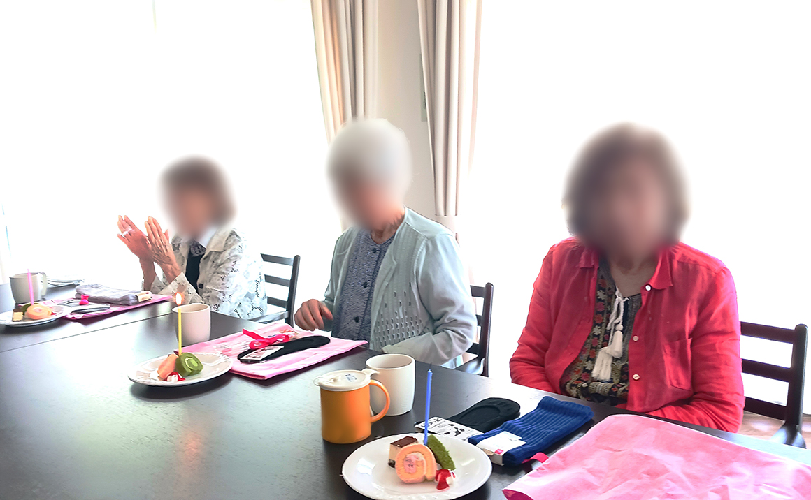 また、ささやかですが施設から誕生日プレゼントをお渡しし、入居者様全員でバースデーソングを合唱。 そしてケーキを美味しくいただきました。