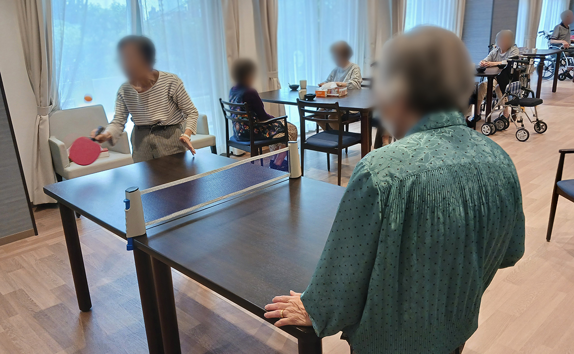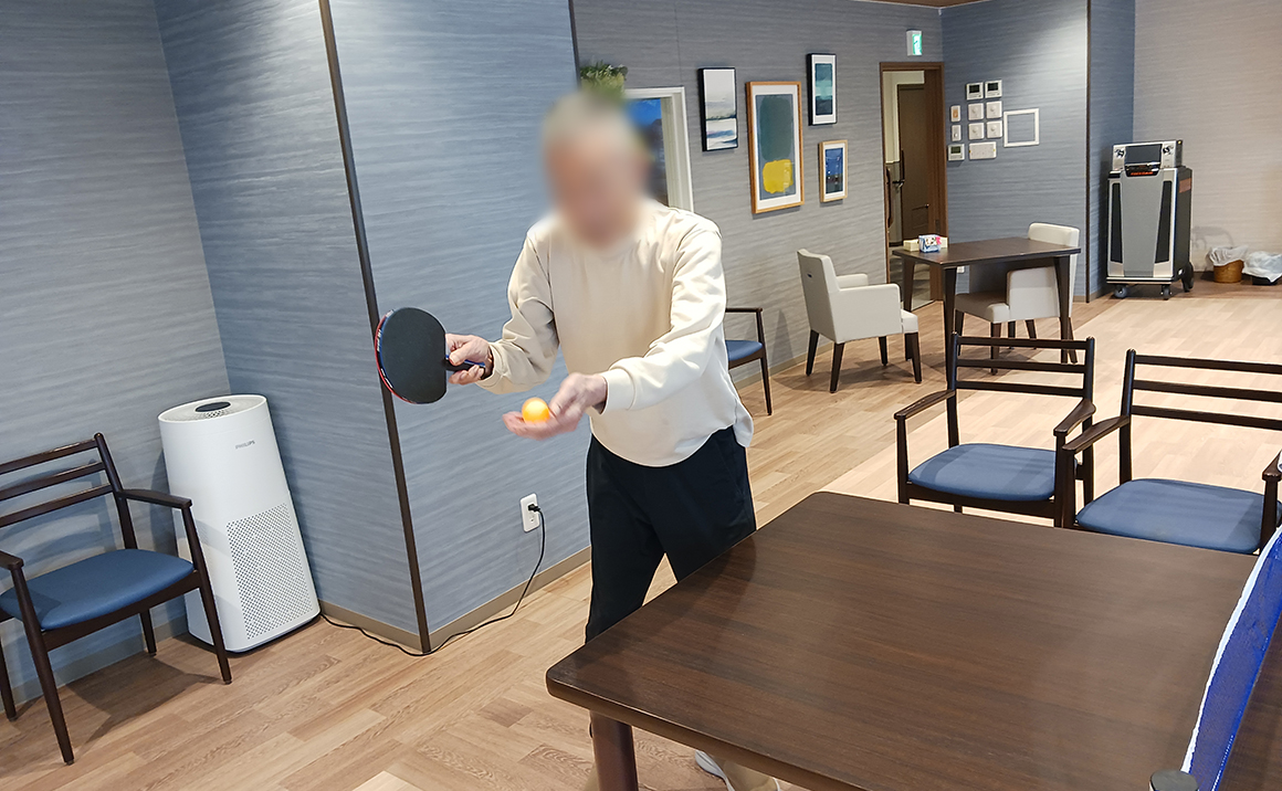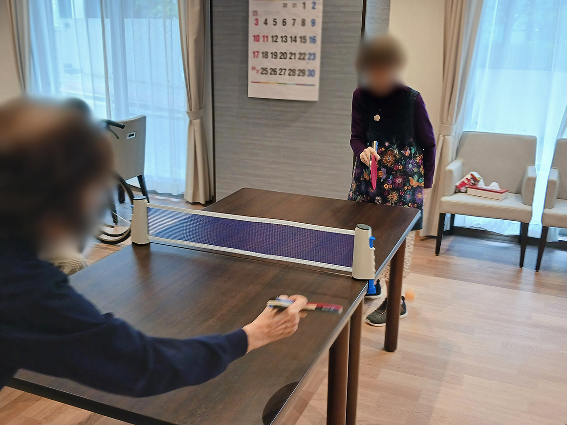この日は全員参加の卓球大会を開催しました。 皆様しっかり足を踏ん張ってラケットを振っていらっしゃいましたよ。 真剣にピンポン球を追いかける眼差し、スマッシュを決めて1点を決める喜び、空振り時の悲しい表情や笑いなどたくさんの喜怒哀楽が垣間見れたひと時でした。