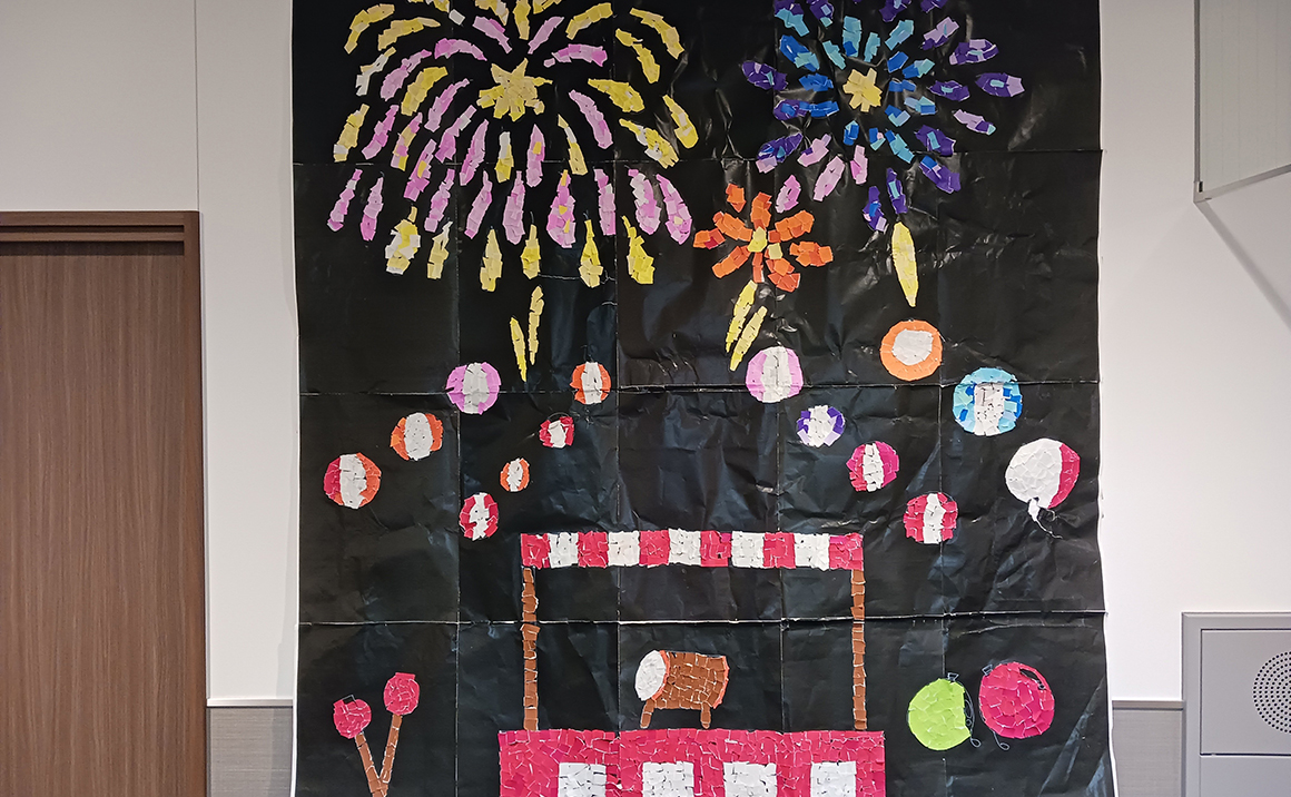 ご入居者と一緒に制作した、題して「花火と夏祭り」の貼り絵。