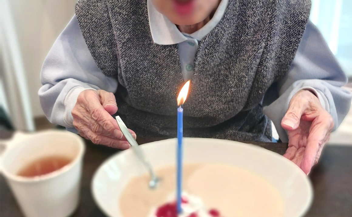 今月も誕生日会を開催いたしました。 今月は6名様。 おひとり体調が優れず全員揃っての参加とはなりませんでしたが、参加いただいた皆様は元気に乾杯とたくさんの笑顔が終始見れました。