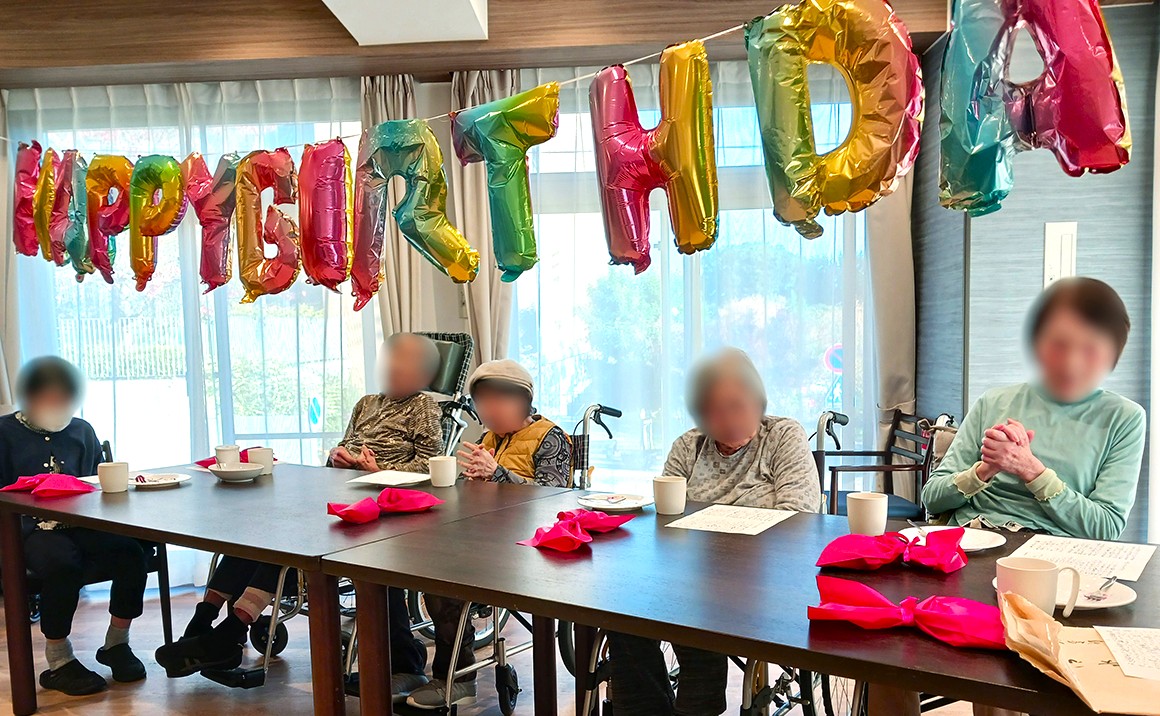 この日の午後は毎月恒例の誕生日会を開きました。 11月は7名様です。 全員でハッピーバースデーを歌い、一緒にお祝いをしましたよ。 ケーキを召し上がられ、プレゼントをお渡しした後には詩吟を披露される方やシャンソンを歌われる方など多才な皆様です。