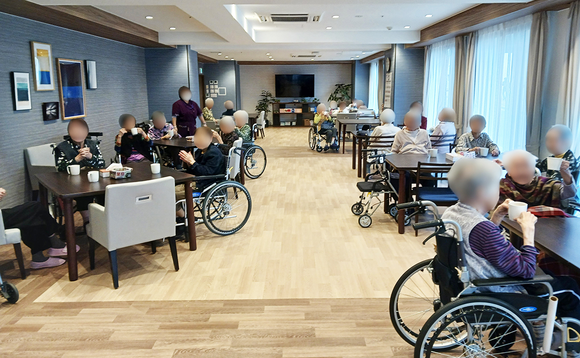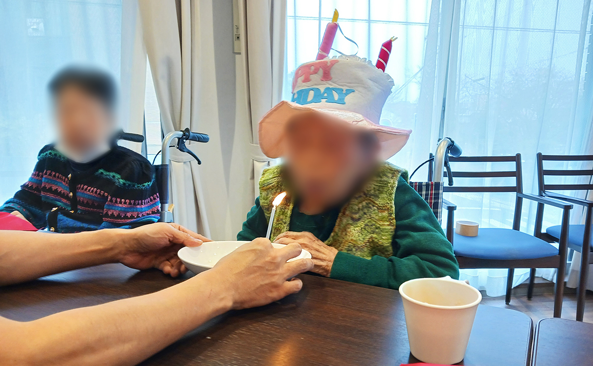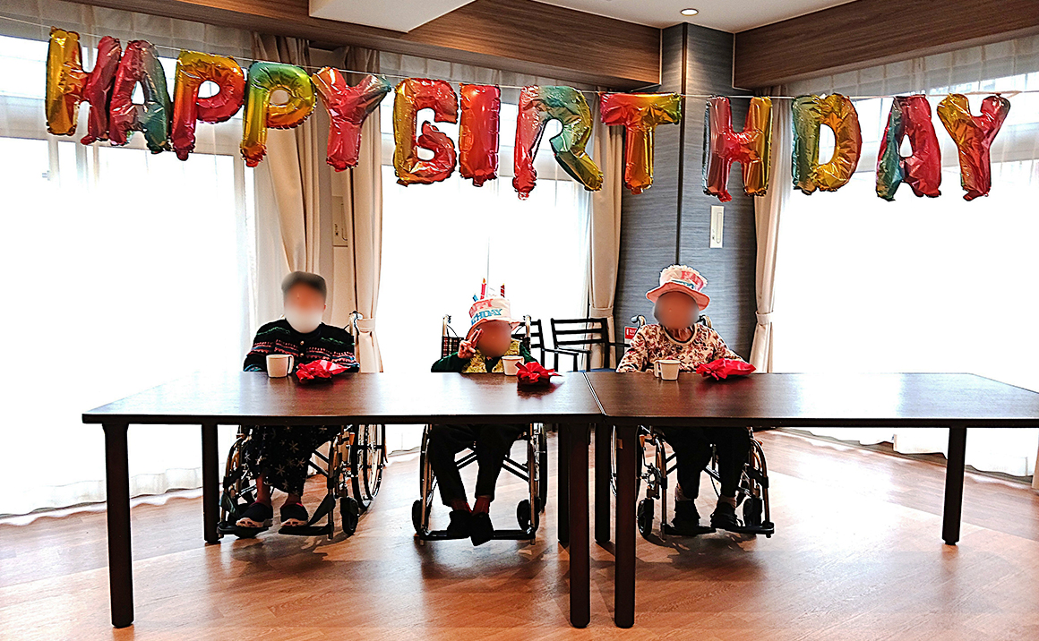 3月生まれの方は4名様でしたが、おひとり体調不良ということで3名様で少し寂しいですが、今月の誕生日会を開催いたしました。 なかなか交流が少ない方も自然と会話が弾む、そんな誕生日会でした。 ろうそくの火を息で消すところを手で消されるちょっとしたハプニングもありつつ、 全員で乾杯をし、美味しくケーキをいただきました。
