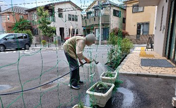 プレザンメゾン西東京恒例、正面玄関の「緑のカーテン」準備をいたしました。