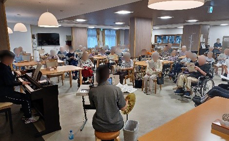 ご入居者様から「懐かしい」「楽しい」と声掛けがあり、アンコールにも答えて頂いた、うれしい時間になりました。