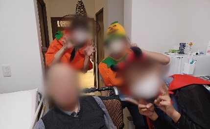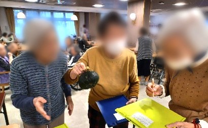 プレザンメゾン西東京 今年の「ハロウィンパーティー」です。 職員と実習生の「おばけ」が皆様を訪問しました。 おばけからご入居者様へお菓子のプレゼントです。 にぎやかな笑い声が食堂いっぱいに広がりました。 かぼちゃの重さ当てイベントでは2名の方が正解され、豪華景品をゲットされました。