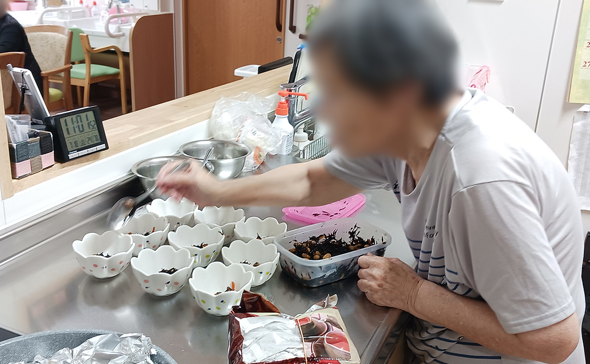 たのしい家川崎溝の口では自身で出来ることは積極的に行っていただいております。 台所にも入っていただき、調理や片付けなど出来る範囲で手伝っていただけるような支援を実施しています。
