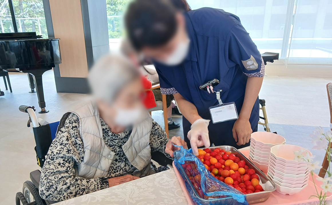 当施設で春に植えたトマトやししとうが育ち、収穫・実食をしていただきました。