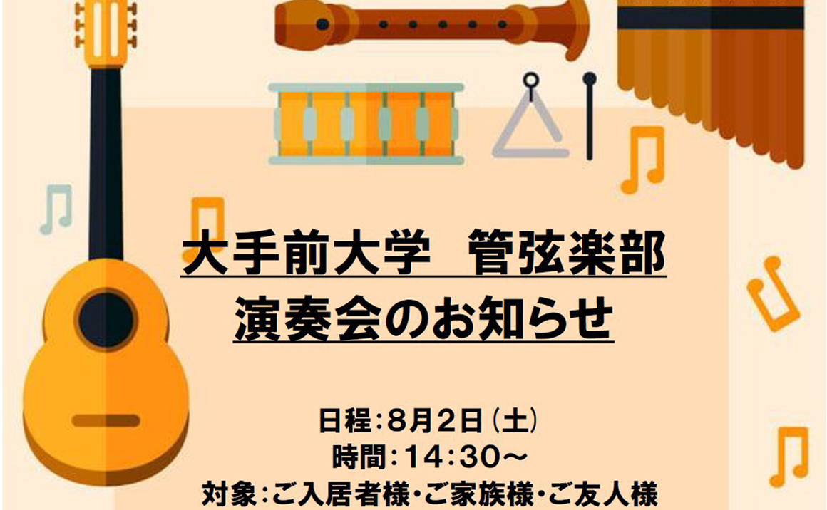 8月もイベントが盛りだくさんですが、今月の目玉は当施設では初めてお招きする形となる8/2の大手前大学管弦楽部さんの演奏会です。