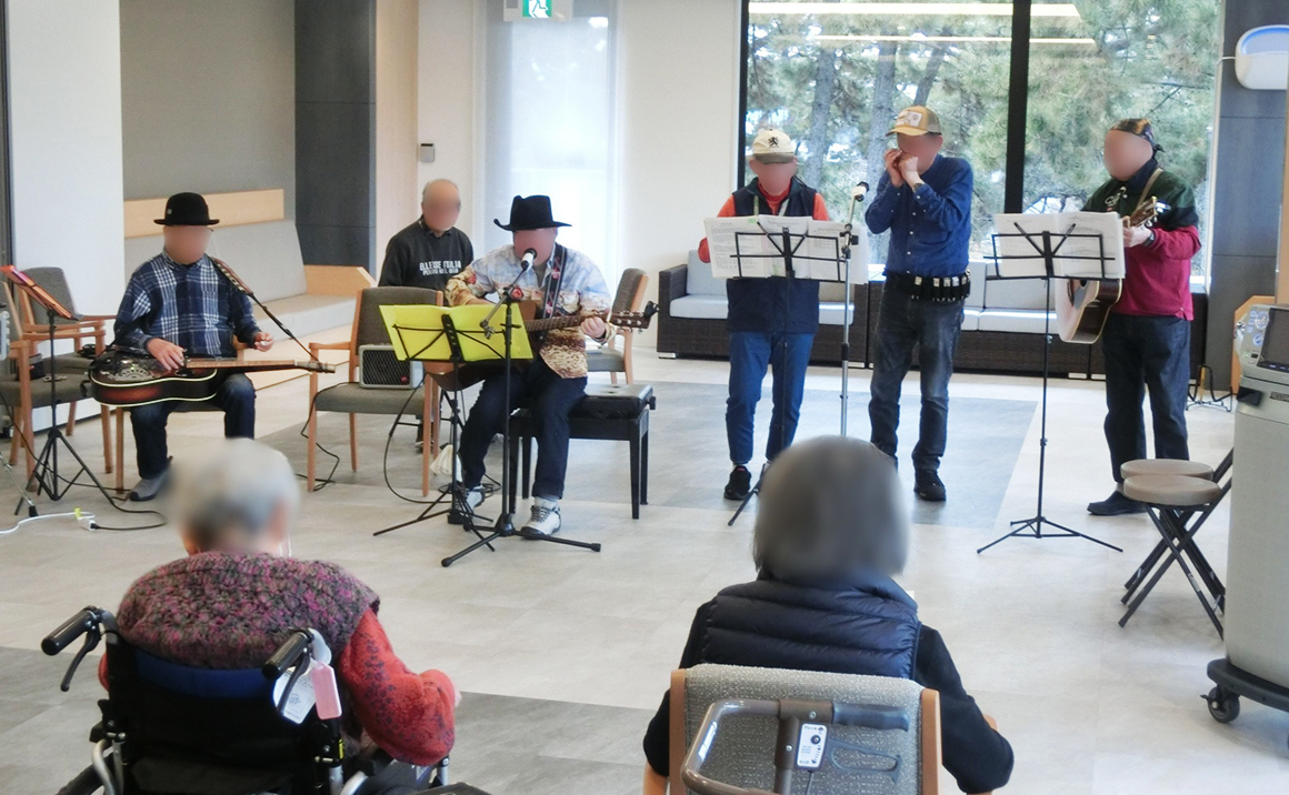 カントリーバンド・The Full Houseさんがライブ演奏に来て下さいました。 ギターやドラム演奏を使った催し物は当施設で初めてだったため、皆様興味深々で観ておられました。 ミドルテンポの優しい音色が和やかな空間を作ってくれます。 ご入居者様より、「良かったよ~。なんだか元気を貰えた!」と言っていただきました。 春の桜まつりにまたお越しいただく予定です。 またイベントの予定を随時告知いたしますので、ブログをご確認下さいね。