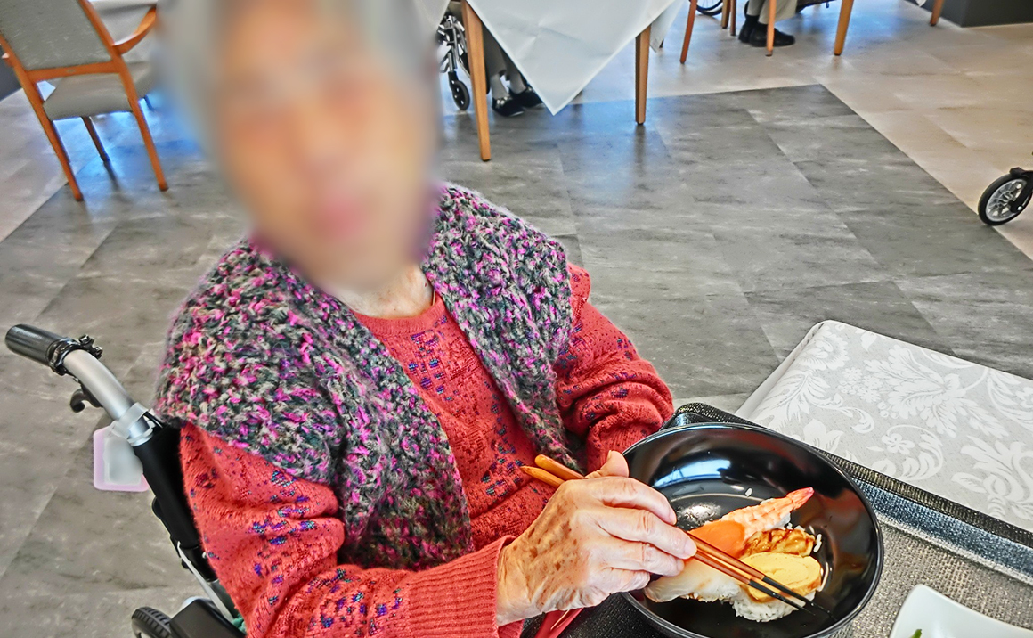 握り寿司ランチを提供しました。 最初にお寿司盛り合わせをお出しし、ご希望の方にお好きなネタをおかわりしていただきました。 「うなぎ好きやねん!」「巻きずしがもっと食べたいから持って来て~」と、皆様ご自由にお好みのネタを注文しておられました。 お寿司が好物の方はとても多く、生魚を提供しやすい冬になると必ず寿司イベントを行います。 喜んでいただけて何よりです♪