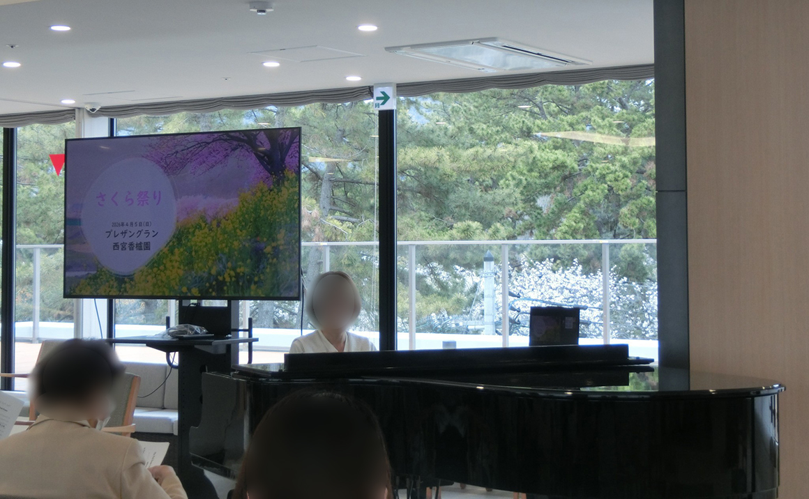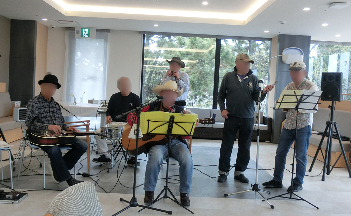 4月5日に、プレザングラン西宮香櫨園にてさくら祭りを開催しました。 連日雨続きだったにも関わらず、この日の天気は晴れ、桜も丁度見ごろの良い日でした。 今年のゲストはカントリーバンド・The fullhouse様。西宮市を中心にご活躍されておられます。 以前も施設にて演奏いただき、ご入居者様に大好評だったため再度お越しいただきました。 思わず手拍子したくなるような楽しげな曲調で心が踊ります。 来られたお客様もすっかりファンになって帰って行かれました。