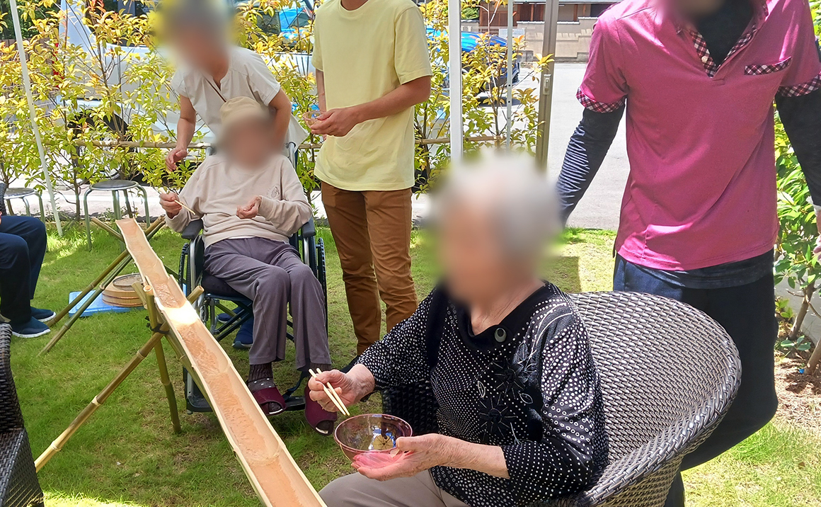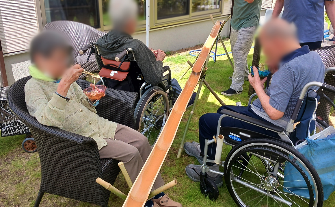 まだまだ暑い日が続いており寝苦しい季節となっています。 8月はたのしい家きぬかけの庭で流しそうめんイベントを開催しました。 本物の竹を購入し組み立て水を流し本格的な流しそうめんイベントとなりました。 ご家族様にも来ていただき大盛況でした。 8月末には夏祭りを開催します。ぜひご来場お待ちしております。