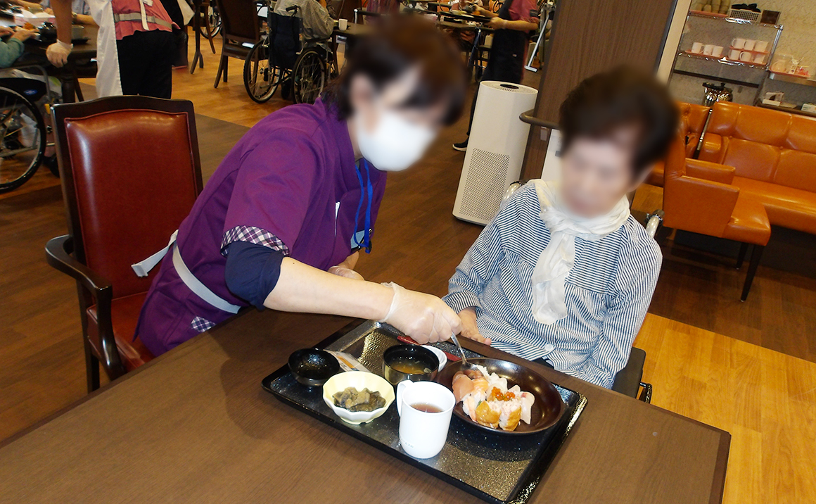 今日の昼食は「寿司レク」と称しまして 昼食が握り寿司食べ放題の日です!! 先月も開催いたしましたが、今月は味がパワーアップしさらに美味しくなり 御入居者様にも大変好評でした 女性の御利用者様も二人前召し上がる方もいらっる程の美味しさでした