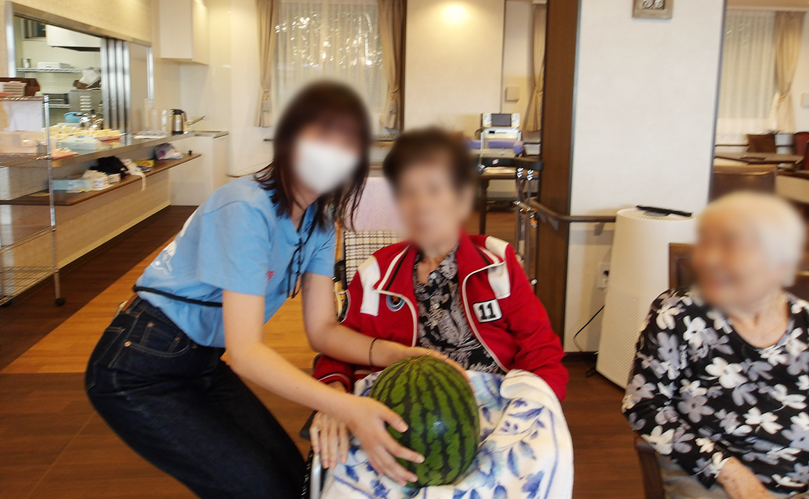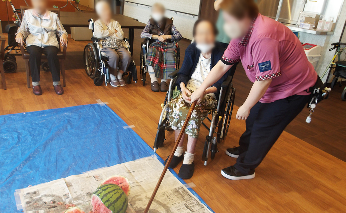 今日は、スイカ割りのご様子を御覧いただこうと思います 大きなスイカを調達致しました この大きなスイカで今日はスイカ割り大会です 目隠しをして、木刀を持ってスイカに近づきます スイカに木刀が当たったら、大歓声が上がります ひびがスイカに入った時も大歓声が上がります 見事にスイカが割れたときは今日一番の大歓声があがりました すいかは皆さんでおやつに食べました みずみずしくてあまいスイカでしたね