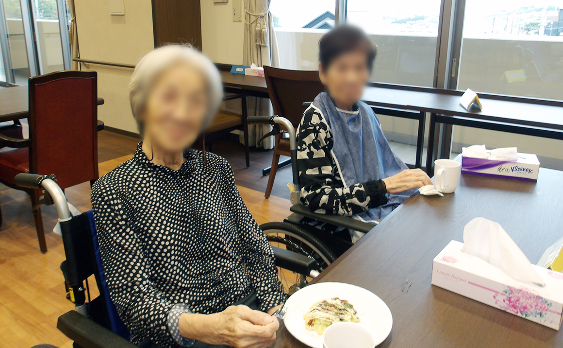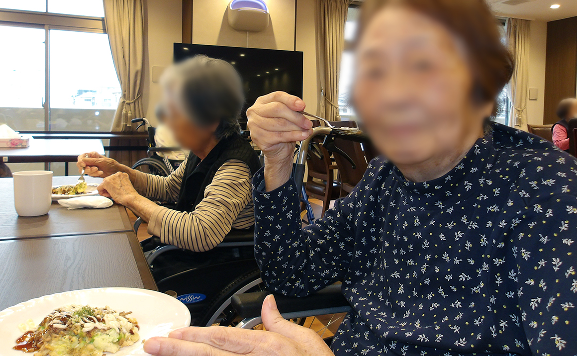 今日は3階フロアのお好み焼きパーティのご様子を御覧頂こうと思います 今回のお好み焼きパーティは、職員が何日も前から入念に計画を練ったり、 仕込みをしたりと気合が入っていました ホットプレートで、それぞれお好み焼きを焼いていきます ソースの焦げる香りは関西人にはたまらないですね 御入居者様もソースの香りにニコニコ、お好み焼きを食べてニコニコ ひさしぶりのお好み焼き美味しかったですね