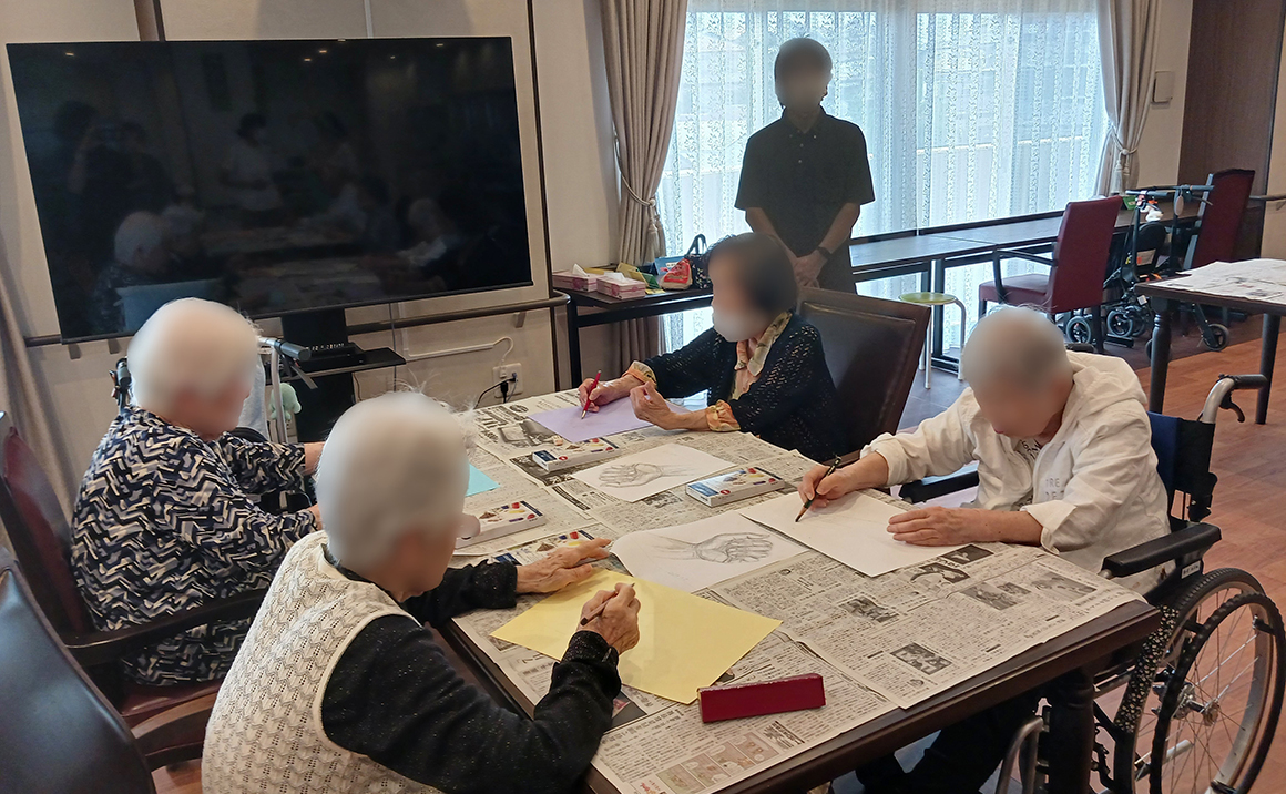 自分の手を見ながら模写をしたり、先生の書いてくださった見本の手を見ながら画用紙に描いていきます