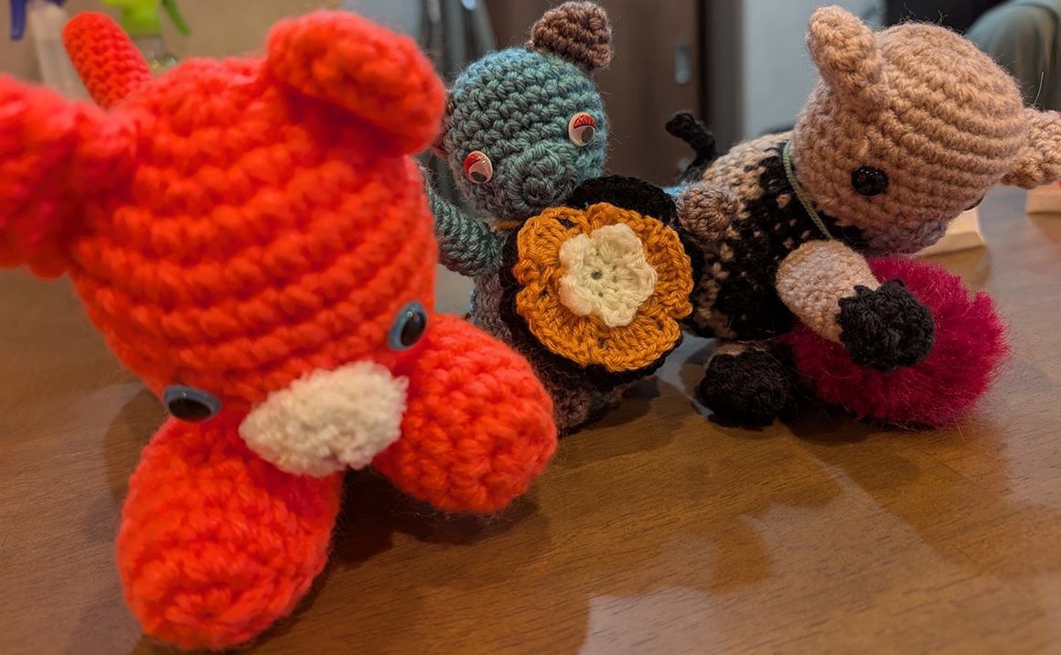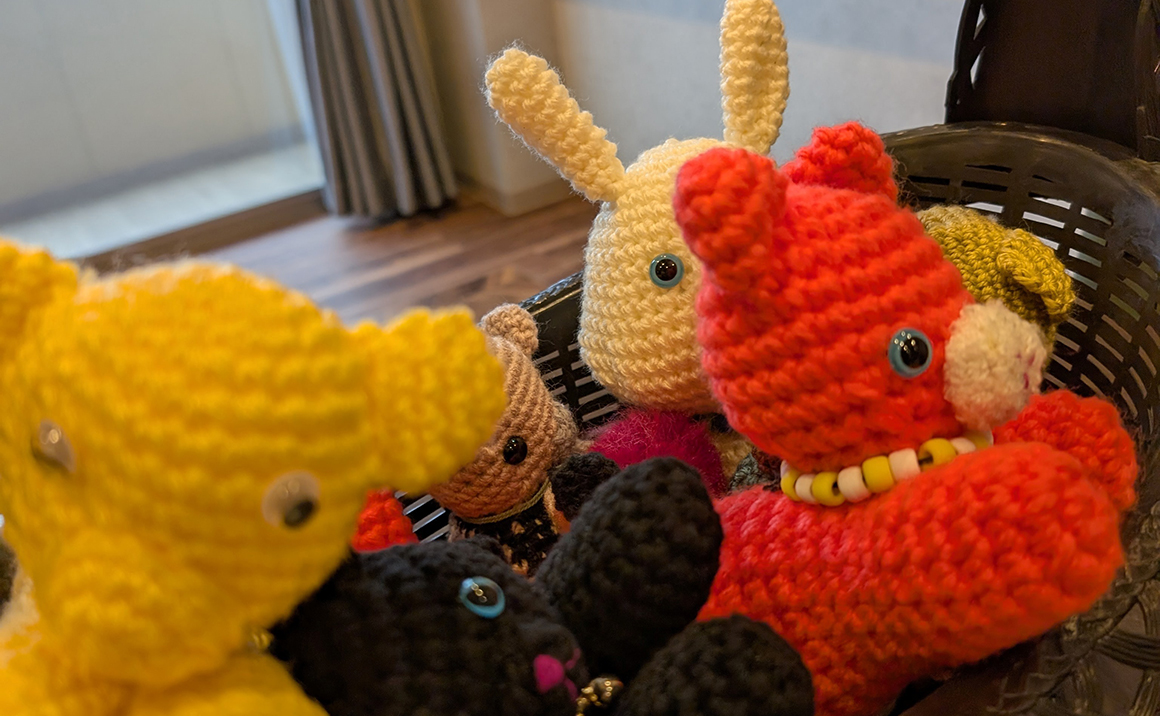 プレザンメゾン神戸ジェームス山では、毛糸クラブの活動が大変盛んです 2Fフロアには編み物の元先生がおられます その方を中心に編み物の輪が広がっています 1枚目の画像の右側の方はできたばかりの新作のベストが完成し、お披露目してくださいました 館内にはご入居者様が編まれたあみぐるみがあちこちに置かれています 通るたびに「かわいいねぇ」などと会話が弾みます 見ているだけで優しい気持ちになります