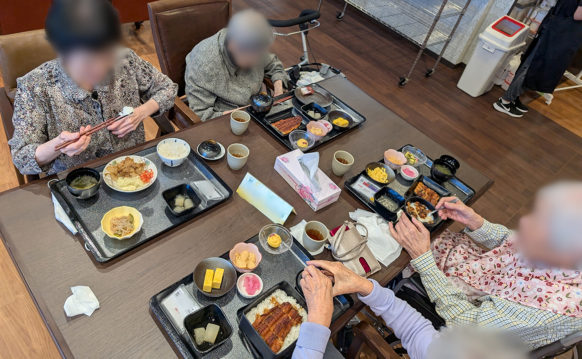毎日暑い夏が続いていますね ここ神戸市垂水区も連日34℃を超えています 毎日暑いと食欲もなくなりがちですが、そこで暑い夏を乗り越えてもらおうと 本日の昼食のメニューは「鰻丼」です 鰻は元気になる素がたくさん含まれています 暑い夏を元気に乗り切るために入居者様と一緒に職員も鰻丼を食べました 鰻を食べて元気に暑い夏を乗り越えて行きましょう