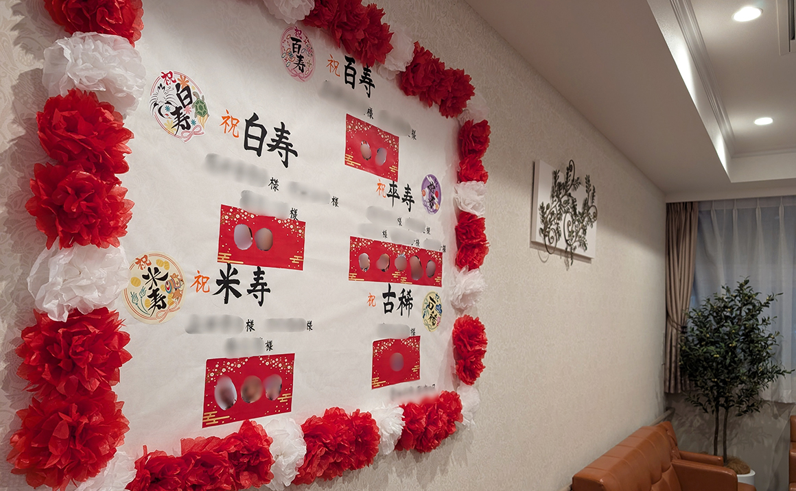 9月23日は敬老の日でした 施設でも敬老の会を開催致しました プレザンメゾン神戸ジェームス山には古希から百寿の方までいらっしゃいます お習字の得意な看護師がお1人お1人のお名前を丁寧に書いていきます 1階のエレベーターホールに立派な横幕が出きました