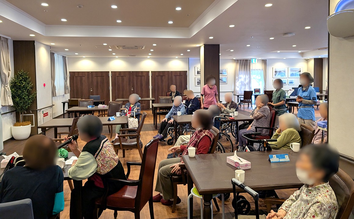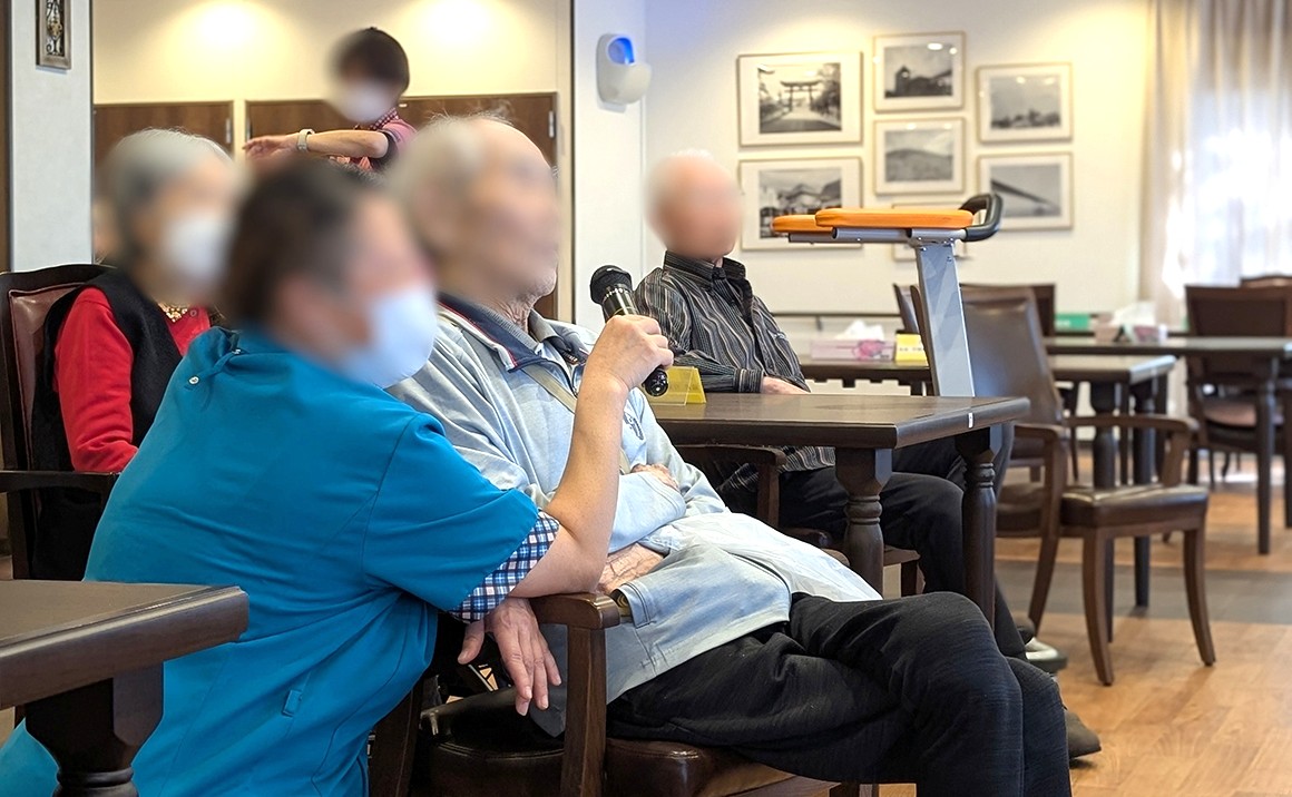 今日は、カラオケ大会のご様子をご覧いただこうと思っています 時間がゆったりとすぎる日曜日の午後 急遽「カラオケ大会」をやろうということになり 1階の食堂にカラオケ好きな方が集まってきました ベトナム人の実習生も2人で楽しそうに日本語の歌を歌ってくれました 御入居者様も職員と一緒に歌ったりしてカラオケを楽しまれました 皆さんの前で歌を歌うのは緊張するけれど楽しい時間になりました