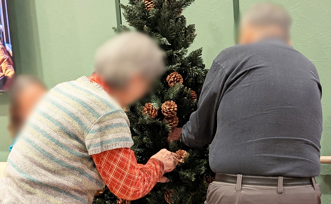 職員がクリスマスツリーの準備に取りかかるとご入居者様も一緒にお手伝いをしてくださいました