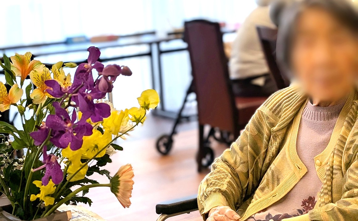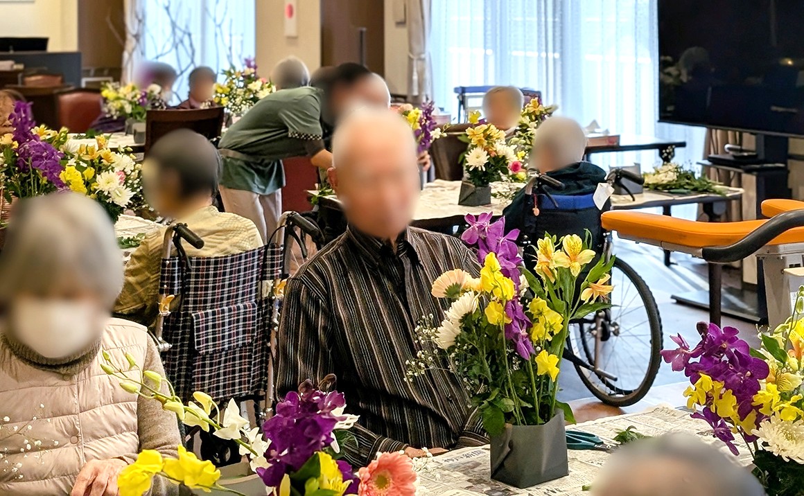 本日はフラワーアレンジメントのご様子をご覧いただこうと思っています 最近のフラワーアレンジメントは菊などお花と海外のお花を一緒に混ぜて使うようで現代的な作品が仕上がっていきます 女性も男性も一緒になってお花と向き合う時間は、自分とも向き合う時間となっています フラワーアレンジメント教室は第2、4 月曜日の14時からとなっています