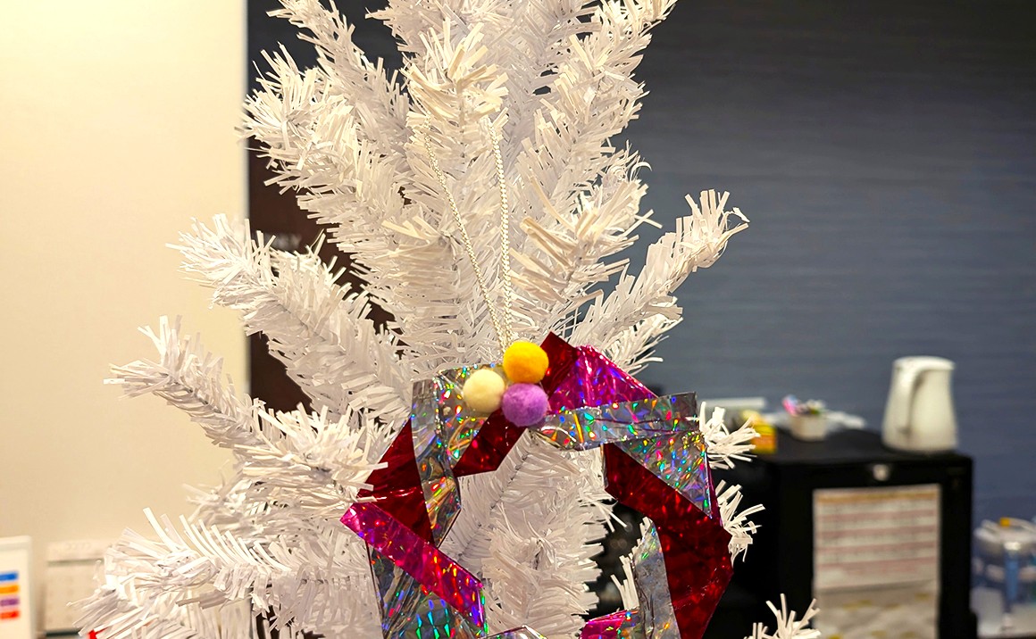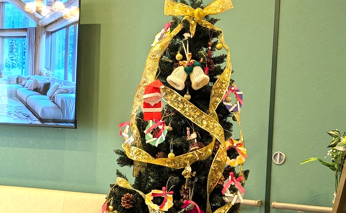 プレザンメゾン神戸ジェームス山の1階談話室には立派なクリスマスツリーがあります 3Fフロアの入居者様が折り紙で作られたリース、毛糸で編んでくださったベルなどのをオーナメントを作ってクリスマスツリーに 飾ってくださっています プレザンメゾン神戸ジェームス山のクリスマスの準備は着々と仕上がってきています