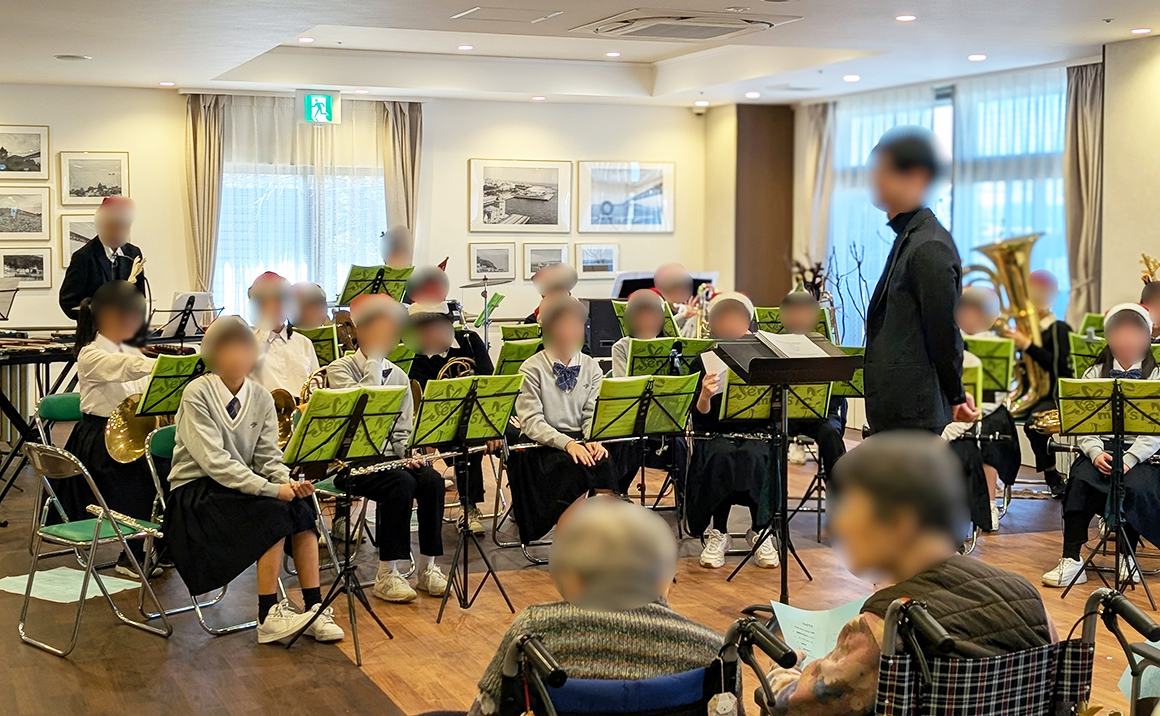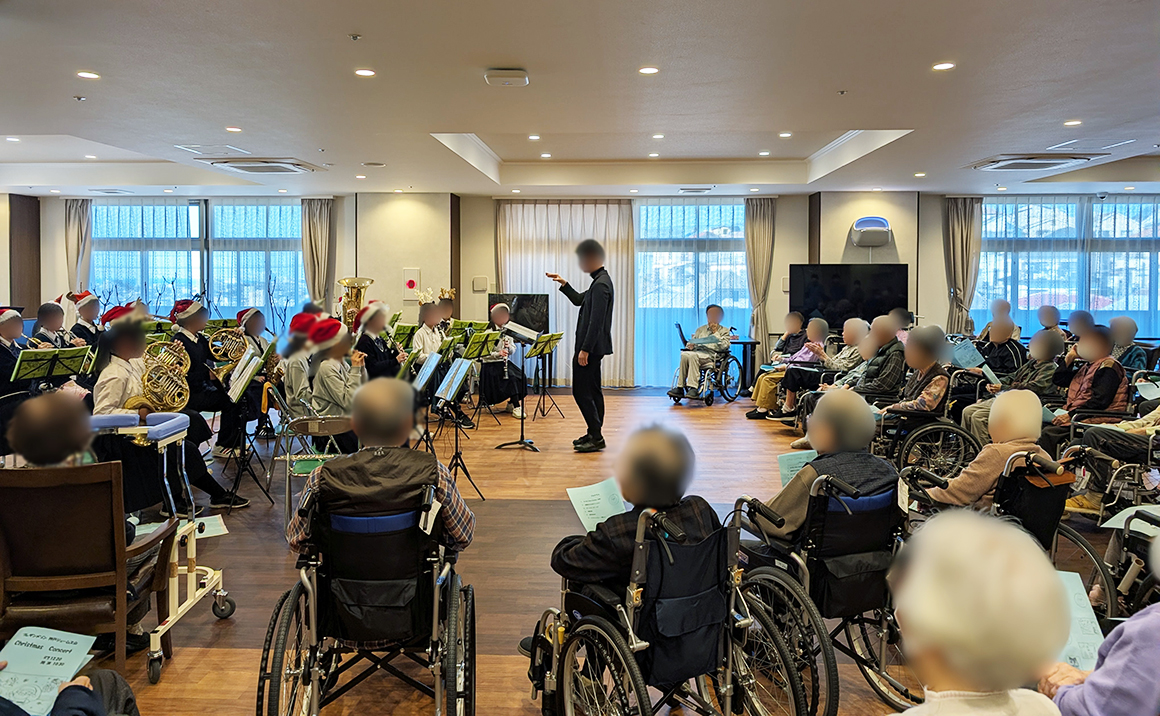 クリスマスソングの合唱から始まり、ディズニーメドレーなど、入居者様にもわかる演奏曲でしたので入居者様も手拍子したりして