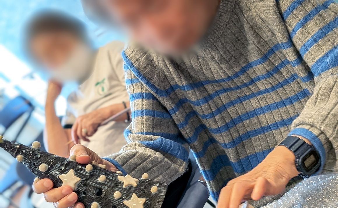 先日の陶芸教室で作った クリスマスツリー型ランプが完成しました 先生の窯で焼き上げてクリスマスに間に合うようにもってきてくださいました トップの星形とお名前のサインの入ったところの星形は黄色にカラーリングされています 開封の時に皆様のワクワクした顔☆ ご自分で作ったものが完成すると楽しみですね またこれは、七色に色が変わるライト付きです クリスマスまで居室でロマンティックな雰囲気を醸し出しますね