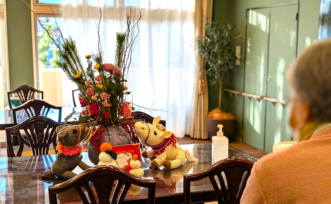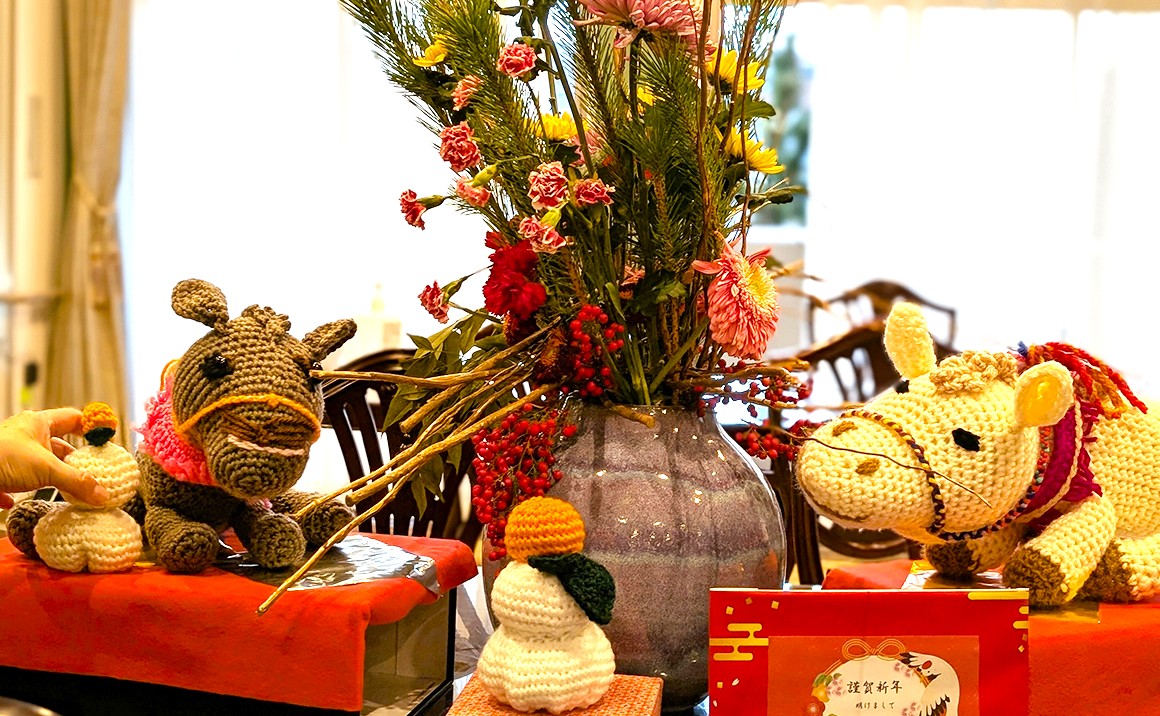 2階フロアの編み物クラブの皆さんが来年の干支の馬の編みぐるみや鏡餅などを持ってきてくださり、1階フロアの玄関前の談話室に飾ってくださいました
