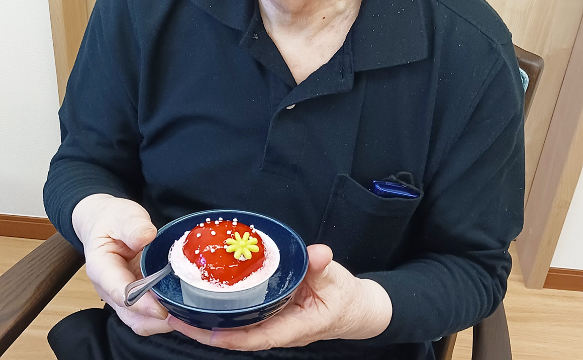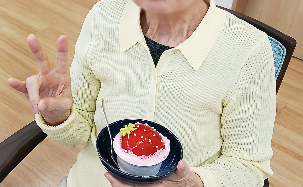 施設に戻ると、おやつには大きなイチゴをモチーフにしたケーキが!!!