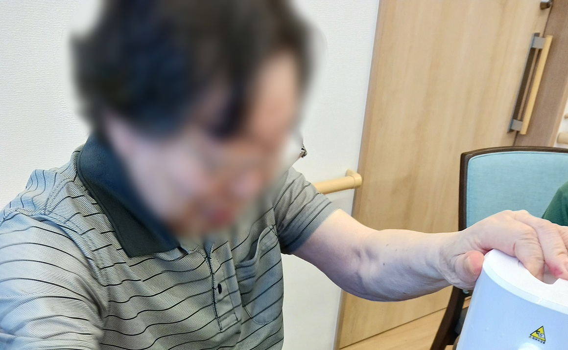 かき氷器をくるくると手で回し、削りだされる氷を見て「これこれ!」とテンションマックスの利用者さんと、余らないかなぁと指をくわえる職員達。