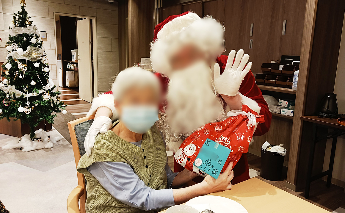 ケーキを召し上がり終えられた頃、サプライズとして女性のサンタクロースがプレゼントを持って登場いたしましたが、数が足りないというハプニングがございました。