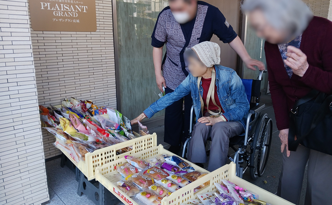 小さな車ながら生鮮食品、パンやお菓子、お惣菜、アイスクリーム、日用品、そしてお花まで…想像以上の充実した品ぞろえにご入居者様のお買い物欲も高まります。