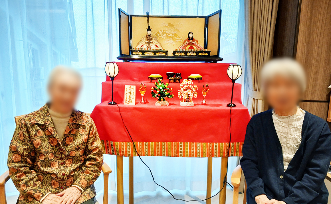 とても気品のある素敵な木目込み雛人形で、2月の中旬からご入居者の皆さまに大切に愛でて頂き、当日は雛人形の前で記念撮影もさせて頂きました。